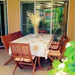 Самостоятелните кухненски удобства включват кухненски бокс с микровълнова фурна, хладилник и кухненска посуда, както и чай и кафе. За подпомагане на физическото благополучие гостите могат да използват фитнес занимания, тераса и градина и да участват във фитнес занимания по време на престоя си. Наличието на сауна и външен плувен басейн гарантира по-релаксиращ престой. Можете да се включите в спортни дейности, организирани от този апартамент, като колоездене, пинг-понг и билярд.